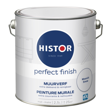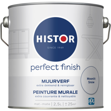Histor Perfect Finish muurverf mat is een extra dekkende, matte muurverf. Het is verkrijgbaar in verschillende kleuren, zowel kant-en-klaar als op de mengmachine. Histor Perfect Finish muurverf Moonlit Snow is een extra dekkende muurverf, ideaal voor alle muren in uw huis. Eenmaal aangebracht bent u verzekerd van een matte uitstraling die langdurig mooi blijft. Naast de standaard beschikbare kleuren is deze verf in meer dan 30.000 verschillende kleuren te verkrijgen bij onze verfmengbalie in de Karwei bouwmarkt. Voor het beste resultaat kunt u het beste vooraf een dekkende voorstrijk gebruiken. Zorg voor stijlvolle, matte muren in huis met Histor Perfect finish muurverf mat. De inhoudsmaat is 2,5 liter.