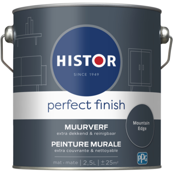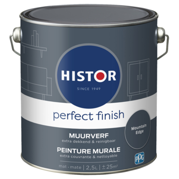 Histor Perfect Finish muurverf mat is een extra dekkende, matte muurverf. Het is verkrijgbaar in verschillende kleuren, zowel kant-en-klaar als op de mengmachine. Histor Perfect Finish muurverf Mountain Edge is een extra dekkende muurverf, ideaal voor alle muren in uw huis. Eenmaal aangebracht bent u verzekerd van een matte uitstraling die langdurig mooi blijft. Naast de standaard beschikbare kleuren is deze verf in meer dan 30.000 verschillende kleuren te verkrijgen bij onze verfmengbalie in de Karwei bouwmarkt. Voor het beste resultaat kunt u het beste vooraf een dekkende voorstrijk gebruiken. Zorg voor stijlvolle, matte muren in huis met Histor Perfect finish muurverf mat. De inhoudsmaat is 2,5 liter.