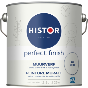 Histor Perfect Finish muurverf mat is een extra dekkende, matte muurverf. Het is verkrijgbaar in verschillende kleuren, zowel kant-en-klaar als op de mengmachine. Histor Perfect Finish muurverf Ral 9003 is een extra dekkende muurverf, ideaal voor alle muren in uw huis. Eenmaal aangebracht bent u verzekerd van een matte uitstraling die langdurig mooi blijft. Naast de standaard beschikbare kleuren is deze verf in meer dan 30.000 verschillende kleuren te verkrijgen bij onze verfmengbalie in de Karwei bouwmarkt. Voor het beste resultaat kunt u het beste vooraf een dekkende voorstrijk gebruiken. Zorg voor stijlvolle, matte muren in huis met Histor Perfect finish muurverf mat. De inhoudsmaat is 2,5 liter.