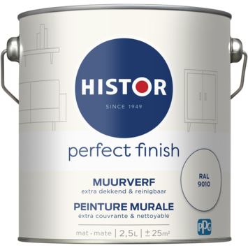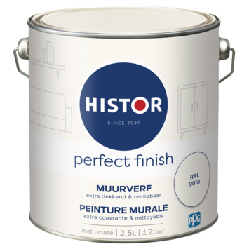 Histor Perfect Finish muurverf mat is een extra dekkende, matte muurverf. Het is verkrijgbaar in verschillende kleuren, zowel kant-en-klaar als op de mengmachine. Histor Perfect Finish muurverf Ral 9010 is een extra dekkende muurverf, ideaal voor alle muren in uw huis. Eenmaal aangebracht bent u verzekerd van een matte uitstraling die langdurig mooi blijft. Naast de standaard beschikbare kleuren is deze verf in meer dan 30.000 verschillende kleuren te verkrijgen bij onze verfmengbalie in de Karwei bouwmarkt. Voor het beste resultaat kunt u het beste vooraf een dekkende voorstrijk gebruiken. Zorg voor stijlvolle, matte muren in huis met Histor Perfect finish muurverf mat. De inhoudsmaat is 2,5 liter.