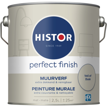 Histor Perfect Finish muurverf mat is een extra dekkende, matte muurverf. Het is verkrijgbaar in verschillende kleuren, zowel kant-en-klaar als op de mengmachine. Histor Perfect Finish muurverf Veil of Dusk is een extra dekkende muurverf, ideaal voor alle muren in uw huis. Eenmaal aangebracht bent u verzekerd van een matte uitstraling die langdurig mooi blijft. Naast de standaard beschikbare kleuren is deze verf in meer dan 30.000 verschillende kleuren te verkrijgen bij onze verfmengbalie in de Karwei bouwmarkt. Voor het beste resultaat kunt u het beste vooraf een dekkende voorstrijk gebruiken. Zorg voor stijlvolle, matte muren in huis met Histor Perfect finish muurverf mat. De inhoudsmaat is 2,5 liter.