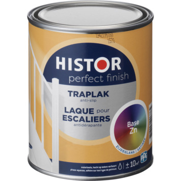 Histor Perfect Finish traplak is speciaal ontwikkeld voor het schilderen van houten trappen binnenshuis. De lak is anti-slip en voelt een beetje stroef aan, hierdoor voorkom je uitglijden. De lak is zeer kras- en slijtvast, extra dekkend en geurarm. De lak is op waterbasis en kan gebruikt worden over elke vorige verfsoort heen, dus ook over terpentineverf. Voor het beste resultaat raden wij eerst het gebruik van grondverf aan. De verf is makkelijk aan te brengen en je trap is snel weer beloopbaar. Na 1 uur is de verf stofdroog en na 5 uur overschilderbaar