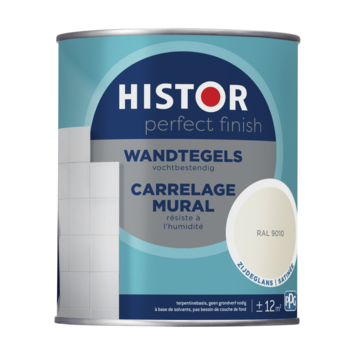 De Histor Perfect Finish wandtegels zijdeglans RAL 9010 750 ml is een lak op terpentinebasis die je speciaal kunt gebruiken voor het schilderen van wandtegels binnen. Je hoeft geen grondverf aan te brengen want deze verf hecht direct op de tegels. Dat maakt het schilderen makkelijker en sneller. De verf is vochtbestendig dus je kunt hem gebruiken in ruimtes waar het vaak vochtig is, zoals de badkamer of het toilet. Je kunt de tegels na het schilderen goed schoonmaken want de verflaag is afwasbaar. Deze verf is bedoeld voor wandtegels die niet in contact komen met direct water. Je kunt hem dus gebruiken in een badkamer maar niet in een douchecabine waar water direct op de tegels komt. Ook is hij zeer krasvast zodat de tegels er lang netjes uit blijven zien, zelfs als ze veel gebruikt worden.