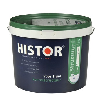Histor STRUCTUUR FIJN 10L 7000 WIT is een matte muurverf met een fijne korrelstructuur geschikt voor muren en plafonds binnenshuis. Deze uitstekend dekkende muurverf camoufleert kleine oneffenheden op je muur en is hierdoor geschikt voor het renoveren van je muren. Daarnaast is Histor Structuur Fijn door zijn korrelstructuur bestand tegen een stootje. Dat maakt de verf geschikt voor intensief gebruikte ruimtes zoals trappenhuis en gang. En mocht je over een aantal jaar een andere kleur willen, dan is Histor STRUCTUUR FIJN 10L 7000 WIT goed overschilderbaar met een Histor Perfect Finish muurverf.