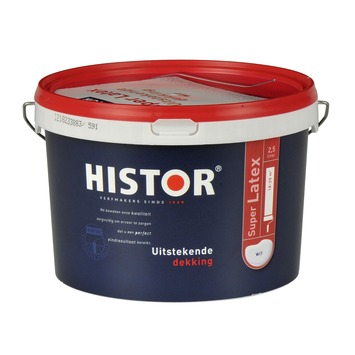 Histor super latex 2,5l 7000 wit is een matte witte muurverf die uitstekend dekt. Histor super latex levert alle eigenschappen die je van een goede muurverf verwacht en is geschikt voor muren en plafonds. Met Histor super latex 2,5l 7000 wit ben je dus voor de juiste prijs snel klaar.