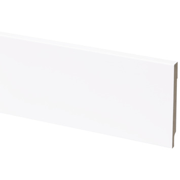 Muurplint van MDF voorzien van een kras- en stootvaste witte zijdeglans laklaag in de kleur RAL9003. De plint heeft een lengte van 244cm, een hoogte van 119mm en een diepte van 12mm na montage. Deze plint is geschikt voor toepassing in huis. Je kunt deze plint monteren met montagekit. Het gebruikte MDF is FSC gecertificeerd en daarmee afkomstig uit duurzaam beheerde bossen.