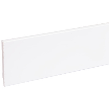 Muurplint van kwastvrij Grenen voorzien van een kras- en stootvaste witte zijdeglans laklaag in de kleur RAL9010. De plint heeft een lengte van 244 cm, een hoogte van 119 mm en een diepte van 12 mm na montage. Deze plint is geschikt voor toepassing in huis. Je kunt deze plint monteren met montagekit. Het gebruikte hout is FSC gecertificeerd en daarmee afkomstig uit duurzaam beheerde bossen. Afneembaar met vochtige doek en niet-agressief schoonmaakmiddel.