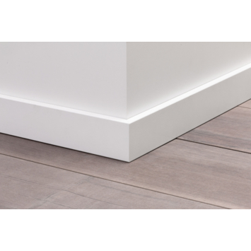 Muurplint van MDF voorzien van een kras- en stootvaste witte zijdeglans laklaag in de kleur RAL9003. De plint heeft een lengte van 244cm, een hoogte van 57mm en een diepte van 12mm na montage. Deze plint is geschikt voor toepassing in huis. Je kunt deze plint monteren met montagekit. Het gebruikte MDF is FSC gecertificeerd en daarmee afkomstig uit duurzaam beheerde bossen.