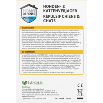 Zit je niet te wachten op ongewenst bezoek van honden en katten in je tuin? De HOME DEFENSE® hondenverjager en kattenverjager ultrasoon 105m² is dé oplossing die je zoekt. Deze verjager maakt gebruik van ultrasone geluiden, hoog in frequentie en onhoorbaar voor mensen, maar zeer onaangenaam voor dieren. Vanaf het moment dat je het apparaat met de juiste batterijen (3 oplaadbare AA-batterijen, niet inbegrepen) hebt geïnstalleerd en opgeladen hebt, stuurt het dag en nacht geluiden uit die binnen een bereik van 105m² hinderlijk zijn voor katten en honden. Dit apparaat werkt op zonne-energie, zodat je je geen zorgen hoeft te maken over chemicaliën. Voor optimale effectiviteit plaats je het in de tuin waar ongewenste dieren het meest gezien worden en zorg je ervoor dat niets de zon blokkeert. De toegevoegde lichtflits schrikt dieren extra af, wat je tuin als een no-go zone voor hen zal maken.