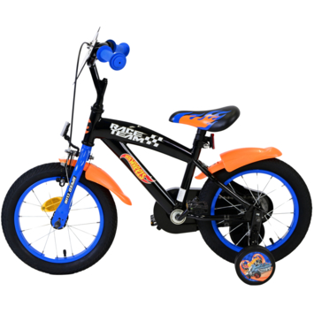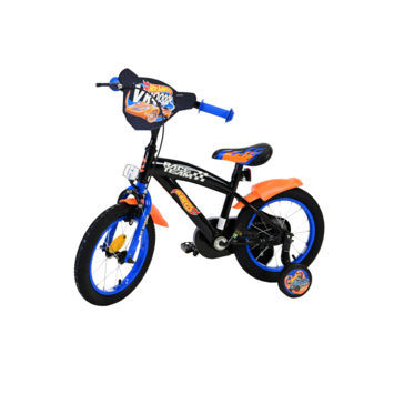De Hot Wheels 14 inch kinderfiets in de stoere kleuren zwart, oranje en blauw is de perfecte fiets voor jonge avonturiers! Deze fiets is een officieel gelicentieerd Hot Wheels-product, wat zorgt voor topkwaliteit en een geweldige uitstraling. Veiligheid staat voorop met een handrem, terugtraprem en een gesloten kettingkast. De afneembare zijwieltjes maken het leren fietsen makkelijker, en de reflectoren in de trappers zorgen ervoor dat je kind altijd goed zichtbaar is, zelfs in het donker.