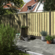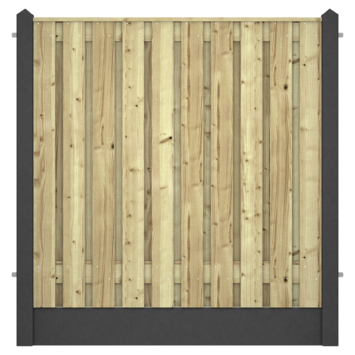 Voor het tuinscherm kun je kiezen tussen twee soorten materialen: geïmpregneerd grenenhout of douglashout. Iedere schutting staat uit 19 planken en dankzij de dichte opbouw, zorgt het scherm voor zowel veel privacy als een hoge windbelastbaarheid. Zoals op de afbeelding te zien is, wordt het scherm verticaal geplaatst.