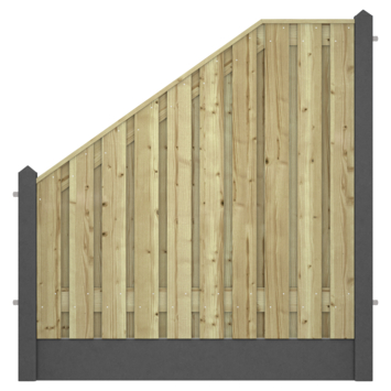 Bij aanschaf van 5 meter aan houtbetonschutting kun je extra elementen toevoegen zoals een schuin aflopend scherm. Ideaal voor een schutting langs je oprit en deze kan mooi worden gecombineerd met een laag scherm (zie artikel 193915).