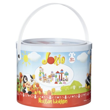 Met de 50 houten Jokie blokken in verschillende vrolijke kleuren maak je de leukste bouwwerken. Dit doe je dus samen met Jokie, Jet en hun vriendjes. Laat de fantasie er op los. Na het spelen kunnen de blokken mooi opgeborgen worden in de handige kartonnen ton met draaghengsel. Vanaf 12 maanden.
