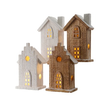 Winters houten huisje (7x10x19 cm) in wit of naturel met LED verlichting op batterij (3 LR44 bijverpakt). Het huisje kun je in een kerstboom plaatsen of verwerken in een kersttafreel voor bijvoorbeeld op tafel. Het huisje past perfect in het kerstthema natuurtinten. Ook past dit huisje in een wit en eucalypthus kleuren thema. Het huisje is per stuk verkrijgbaar.