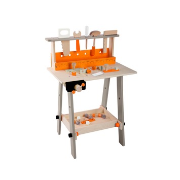 Voor de beginnende klusser een stoere houten werkbank met gereedschaprek, bankschroef, meetlat en opbergbak. Compleet met 32 accessoires zoals houten bouten, houten moeren en houten gereedschap. Afmeting (hxbxd): 74x53x33 cm. Vanaf 3 jaar.