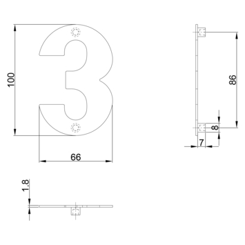 Dit huisnummer is gemaakt van RVS en heeft een afmeting van ongeveer 7 cm breed en 10 cm hoog. De afstandnokjes aan de achterkant zorgen dat het nummer loskomt van de te bevestigen achtergrond. Dit huisnummer is nummer 3.