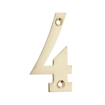 Dit huisnummer is gemaakt van messing en heeft een afmeting van ongeveer 3 cm breed en 6,5 cm hoog. De afstandnokjes aan de achterkant zorgen dat het nummer loskomt van de te bevestigen achtergrond. Dit huisnummer is nummer 4.