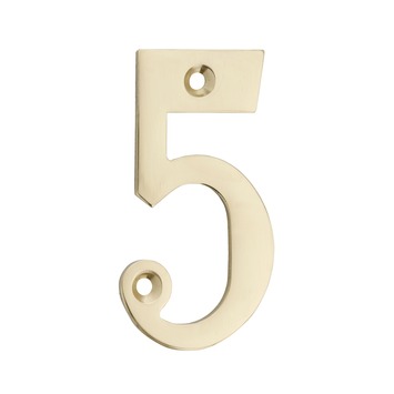 Dit huisnummer is gemaakt van messing en heeft een afmeting van ongeveer 3 cm breed en 6,5 cm hoog. De afstandnokjes aan de achterkant zorgen dat het nummer loskomt van de te bevestigen achtergrond. Dit huisnummer is nummer 5.