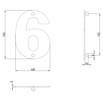 Dit huisnummer is gemaakt van RVS en heeft een afmeting van ongeveer 10 cm breed en 15 cm hoog. De afstandnokjes aan de achterkant zorgen dat het nummer loskomt van de te bevestigen achtergrond. Dit huisnummer is nummer 6 of 9.