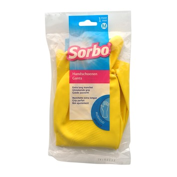 De Sorbo huishoudhandschoenen maat M zijn onmisbare huishoudhandschoenen. De gele handschoenen hebben een extra lang manchet, zodat je goed beschermd bent tijdens je schoonmaakklusjes. De handschoenen zijn sterk en zijn voorzien van een antislip reliëf, zo hoef je dus niet bang te zijn dat je iets laat vallen. De handschoenen zijn geschikt voor middelgrote handen, maat medium.