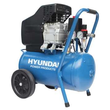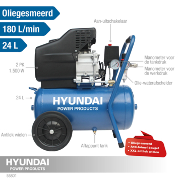 Schoonblazen, oppompen of pneumatisch aandrijven? Deze oerdegelijke, maar krachtige Hyundai compressor zorgt voor lucht in elke situatie, De machine zuigt lucht aan, perst het samen in de riante 24 liter ketel en laat het vervolgens gedoseerd los via de slang of het gekoppelde hulpgereedschap, Een zeer flexibel apparaat voor het schoon- en wegblazen van vuil, het oppompen van allerlei banden en materialen en het aandrijven van (industriële) apparaten en gereedschappen, Een oliegesmeerde compressor geschikt voor zowel de professional als doe-het-zelf'er, Deze Hyundai compressor is voorzien van een stille motor, waardoor het geluidsniveau minimaal is; slechts 66 dB, Bovendien is de compressor zeer stabiel door de extra stevige uitvoering; 2 voetsteunen met anit-vibratie doppen én een anti-tuimelbeugel, De compressor is verder volledig verrijdbaar door 2 soepele, anti-lek wielen, Deze compressor is voorzien van een vochtafscheider, tankdrukmeter, drukregelaar, druk-regelaarmeter en een orion/eu snelkoppeling waardoor luchtgereedschap gemakkelijk is aan te sluiten, Unieke specificaties; - Schoonblazen, oppompen en pneunmatisch aandrijven, - Voltage; 230V - 50 Hz, - Ketel inhoud; 24 liter, - Maximale werkdruk; 8 bar, - Motor vermogen: 1500W / 2,0 PK, - Aantal cilinders; 1, - Oliegesmeerd; SAE30 / SAE10, - Toerental; 2850 per/minuut, - Isolatieklasse motor; B, - Aanzuigvermogen; 180 liter/min, - Geluidsniveau; 66dB(!), - Anti-vibratie ondersteuning; 2 voetsteunen, - Eenvoudig verrijdbaar dankzij 2 soepele, anti-lek wielen, - Inclusief geïntegreerde anti-tuimel beugel, - Afmeting in gebruik; 35x55x62cm - Gewicht; 23,2 kilogram, - Garantie; 2 jaar, - Geleverd met vochtafscheider, tankdrukmeter, drukregelaar, druk-regelaarmeter en een orion/eu snelkoppeling,
