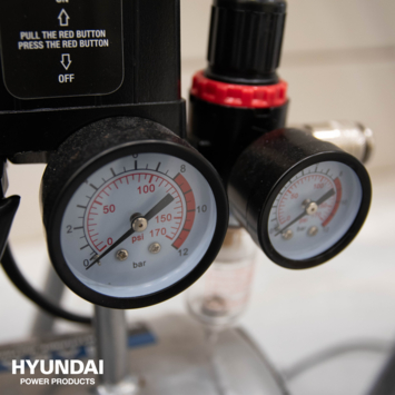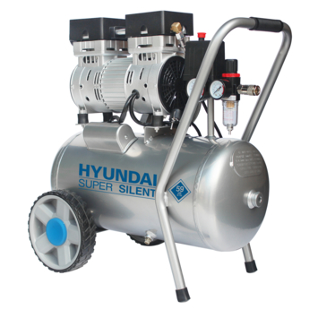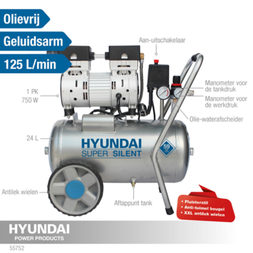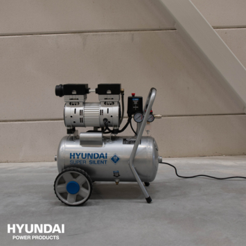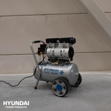 Schoonblazen, oppompen of pneumatisch aandrijven? Deze oerdegelijke, maar krachtige Hyundai compressor zorgt voor lucht in elke situatie, De machine zuigt lucht aan, perst het samen in de riante 24 liter ketel en laat het vervolgens gedoseerd los via de slang of het gekoppelde hulpgereedschap, Een zeer flexibel apparaat voor het schoon- en wegblazen van vuil, het oppompen van allerlei banden en materialen en het aandrijven van (industriële) apparaten en gereedschappen, Een olievrije compressor geschikt voor zowel de professional als doe-het-zelf'er, Deze speciaal uitgevoerde Hyundai compressor is voorzien van een zeer stille motor, waardoor het geluidsniveau minimaal is; slechts 59 dB, Ideaal voor gebruik op plekken waar veel geluid voor veel overlast zorgt, Bovendien is de compressor zeer stabiel door de extra stevige uitvoering; vier voetsteunen met anit-vibratie doppen, Deze compressor is voorzien van een vochtafscheider, tankdrukmeter, drukregelaar, druk-regelaarmeter en een orion/eu snelkoppeling waardoor luchtgereedschap gemakkelijk is aan te sluiten, Unieke specificaties; - Schoonblazen, oppompen en pneunmatisch aandrijven, - Voltage; 230V - 50 Hz, - Ketel inhoud; 24 liter, - Maximale werkdruk; 8 bar, - Motor vermogen: 750W / 1,0 PK, - Aantal cilinders; 2, - Volledig olievrij, - Diameter cilinder; 42mm, - Toerental; 13500 per/minuut, - Isolatieklasse motor; B, - Aanzuigvermogen; 125 liter/min, - Geluidsniveau; slechts 59dB(!), - Anti-vibratie ondersteuning; 2 voetsteunen, - Eenvoudig verrijdbaar dankzij 2 soepele, anti-lek wielen, - Inclusief geïntegreerde anti-tuimel beugel, - Afmeting in gebruik; 36x55x59cm - Gewicht; 22 kilogram, - Garantie; 2 jaar, - Geleverd met vochtafscheider, tankdrukmeter, drukregelaar, druk-regelaarmeter en een orion/eu snelkoppeling,