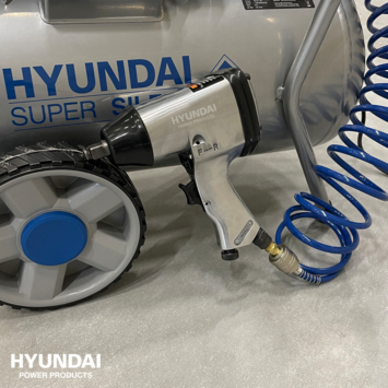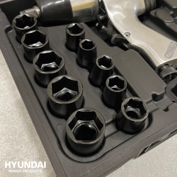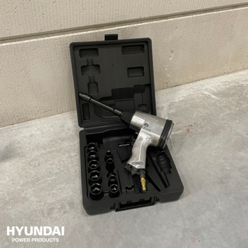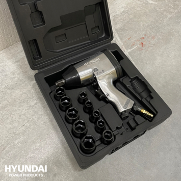 De Hyundai pneumatische slagmoersleutel heeft een maximum koppel van 340 Nm en is geschikt voor werkzaamheden in garage en werkplaats. De machine levert topprestaties met behulp van een perslucht slang met een binnendiameter van 9 mm of meer. Het luchtverbruik is 5,4 m3 /min en een maximale werkdruk van 6,3 bar. De slagmoersleutel is links/rechts omschakelaar en heeft aan de onderzijde van het handvat 4 instelbare slagkracht instellingen, reverse (1-stap) en forward (3-traps) bediening, kan de slagmoersleutel voor een hele reeks werkzaamheden worden gebruikt.
