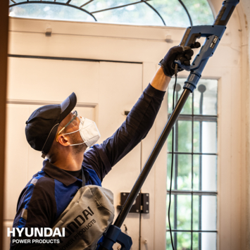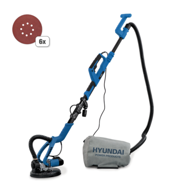 Een plafond of muur schilderen? Het mooiste resultaat bereikt u door eerst te egaliseren en vlak te maken, Deze krachtige Hyundai langnek schuurmachine is geschikt voor het schuren van muren en plafonds van gipsplaten of pleister, De lichtgewicht machine is voorzien van telescopische steel (110-180 cm) en kantelbare/draaibare kop waardoor het mogelijk is om ook op moeilijk toegankelijke plekken te schuren, Het schuuroppervlak is voorzien van klittenband voor eenvoudige en snelle verwisseling van schuurpapier, de sponsen-schijf voorkomt onregelmatig schuren, De machine is voorzien van een geïntegreerd afzuigsysteem met een 2 meter flexibele afzuigslang en ruime stof-opvangzak, incl, verstelbare led lamp Inhoud: - Hyundai langnek muur- en plafondschuurmachine 750W, - 6x vel schuurpapier (korrel 80, 100, 120, 150, 180, 240), - 2x slangadapters; 38 + 47 mm, - Stofzuigerslang 2 meter, - Stof-opvangzak, - Telescoopbuis, - Schouderriem, - Extra handgreep, - Set koolborstels, - S5 interne inbussleutel, - Hyundai handleiding, Unieke specificaties: Unieke specificaties: - Krachtige Hyundai langnek schuurmachine voor het egaliseren van muren en plafonds, - Geschikt voor grote en kleine oppervlakten van gipsplaten en pleisterwerk, - Vermogen; 750W, - Schuuroppervlakte; diamter van 225 mm, - Inclusief stof-opvangzak 20 liter, - Behuizing motor; alluminium, - Aantal snelheden (standen); 6, - Onbelast toerental; 1000-1850 min-1, - Netspanning; 230V, - Netfrequentie; 50 Hz, - Snoerlengte; 4 meter, - Lengte flexibele slang; 2 meter, - Kantelbare schuurkop; 120° graden, - Gewicht; 4500 gram, - Geleverd met diverse Hyundai accessoires, - 2 jaar Hyundai garantie.