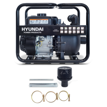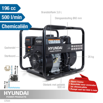 Deze zelf-aanzuigende centrifugale Hyundai vuilwaterpomp is voorzien van een krachtige 196 cc OHV-benzinemotor. Deze waterpomp is geschikt voor gebruik met zeewater of chemicaliën. Omdat het corrosieve en schadelijke vloeistoffen kan verwerken, is het de ideale waterpomp voor bescherming tegen overstromingen, bouw- en industrie toepassingen of pompvereisten in de landbouw. Mede door de afmeting (50 mm) van de in- en uitlaat levert de machine een indrukwekkende en betrouwbare pompkracht met een stroomsnelheid van 500 liter per minuut. Onderdelen in het water, met een diameter tot 7 mm, kunnen worden verpompt en biedt de machine een aanzuighoogte van 7 meter en een totale opvoerhoogte van 23 meter. Met een gewicht van slechts 29 kg is dit een lichtgewicht waterpomp. Eenvoudig te transporteren en op te slaan dus. Het robuuste, open frame beschermt de pomp tegen schokken en stoten en dienen tevens als handgrepen om de waterpomp te verplaatsen. Belangrijkste voordelen: - Lichtgewicht; slechts 2600 gram. - Compacte bouw met een open frame. - Pompt een indrukwekkende 500 liter per minuut. - Aanzuighoogte van maar liefst 7 meter en opvoerhoogte van wel 23 meter. Productspecificatie: - Motorinhoud; 196 cc (Type LS 196) EURO5. - Inhoud brandstoftank; 3.6 liter. - Brandstoftype: Benzine - Euro 95/98 (E10 Loodvrij). - Brandstofverbruik; 380g/kWh. - Bij continue gebruik; 1,8u. - Inhoud oliereservoir; 0.6 liter. - Olietype; SAE 10W-30. - Maximaal vermogen @ 3600 tpm; (pk / kw) 6,5 / 4,85. - Aandrijving type; directe aandrijving. - Startmethode; trek-startkabel. - Inlaat (mm); 50 mm. - Uitgang (mm); 50 mm. - Geluidsdruk LpA: 103 dB(A). - Maximale stroomsnelheid; 500 (liter / minuut). - Pomphuis materiaal: aluminium. - Totale opvoerhoogte; 23m. - Aanzuighoogte; 7 meter. - Afmeting in gebruik; 530 x 400 x 440 mm (LxBxH). - Gewicht in gebruik; 26 kilogram. - Garantie: 2 jaar.