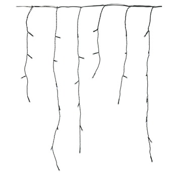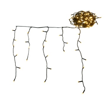 IJsregen (kerst)verlichting voor buiten met groen snoer (kan natuurlijk ook voor binnen) en 200 LED- lampjes koudwit. Uitermate geschikt voor gevel- en dakranden. Met 8 standen voor verschillende lichtfuncties. Lengte van de regensnoeren van 38 cm tot 75 cm. Breedte 3,9 meter met 5 meter aanloopsnoer en 24 volt transformator. Met KemaKeur. Ook met 160 LED-lampjes warmwit verkrijgbaar.