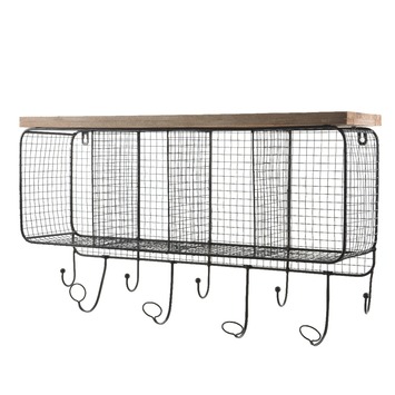 Wandrek met haken is een functineel rek dat je bijvoorbeeld in de keuken, woonkamer of slaapkamer kan ophangen.Wandrek met haken kan voor diverse doeleinden gebruikt worden,als kapstok in de gang, een voorraad rek voor in de keuken maar uiteraard ook vol met decoraties in de woonkamer of slaapkamer. Het wandrek heeft negen haken voor het ophangen van bijvoorbeeld jassen of kookgerei. Ook heeft het wandrek een ijzeren plank en vakjes waar je spullen kan opbergen.