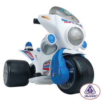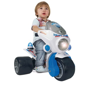 Een elektrische politiemotor met 6 volt accu. Bediening door middel van een gaspedaal. Met echt werkende sirene, zwaailicht, koplamp en elektrische rem. Snelheid 2,5-3 km per uur. Afmeting (lxb): 61x50 cm. Vanaf 1,5 jaar.