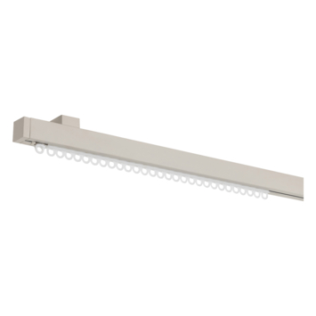 De Intensions gordijnrail Deluxe is een strak vormgegeven gordijnrail welke als complete set geleverd wordt. Bij de rail zitten 3 montagesteunen om de rail aan het plafond te bevestigen, 28 runners om de gordijnen aan op te hangen, 2 eindstoppers en 2 eindkappen. De runners glijden soepel door de rail, waardoor het openen en sluiten van de gordijnen een makkie is. Deze rail is 250 cm lang en uitgevoerd in de kleur warmgrijs. De rail is heel eenvoudig op maat te maken met behulp van een ijzerzaag. Luxe wandsteunen en accessoires zijn los aan te schaffen.