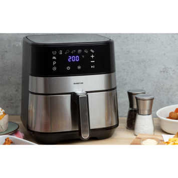 Met een inhoud van 5 liter kan de airfryer tot 1000 gram frites per keer bereiden. Bediening is eenvoudig dankzij het digitale display en de tiptoetsen. Je hebt de keuze uit 8 automatische programma's, of je kunt zelf temperatuur en baktijd instellen. De resterende baktijd wordt tijdens het gebruik weergegeven op het display.
