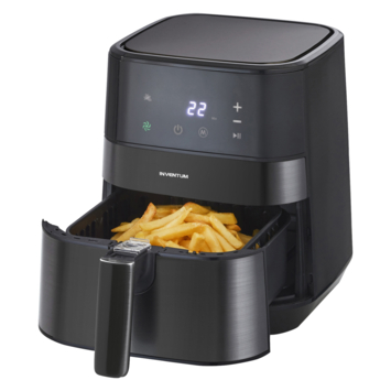 Geniet van heerlijk knapperige frites en snacks met de Inventum airfryer GF350HLDB, en dat vrijwel zonder olie of vet. Deze veelzijdige heteluchtfriteuse kan niet alleen frituren, maar ook grillen, roosteren en bakken. Met een ruime inhoud van 3,5 liter bak je tot 1000 gram frites tegelijk. Het digitale display met tiptoetsen en 8 automatische programma’s maakt het instellen van de temperatuur en baktijd eenvoudig. Bovendien is deze airfryer makkelijk schoon te maken dankzij de vaatwasbestendige pan en frituurmand.