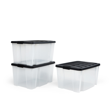 De Handybox opbergboxen van Iris Ohyama zijn ontworpen met een sterk en praktisch design. Deze set bevat 3 opbergboxen met een ruime inhoud van 45 liter per box. Elke box is voorzien van een stevige zwarte deksel met comfortabele grepen en betrouwbare sluitclips voor een veilige afsluiting. Het transparante materiaal maakt het gemakkelijk om de inhoud snel te herkennen. De boxen zijn zowel nestbaar als stapelbaar, waardoor ze ruimtebesparend zijn als ze niet in gebruik zijn. Perfect voor het opbergen van diverse huishoudelijke items zoals speelgoed, schoenen, kleding en andere accessoires. Geschikt voor gebruik in de woonkamer, slaapkamer, keuken, badkamer, garage en kantoor.