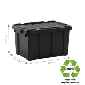 De stevige Powerbox opbergbox van IRIS Ohyama is gemaakt van duurzaam, extra sterk kunststof en bestaat volledig uit 100% gerecycled materiaal. Deze set bevat 3 opbergboxen met elk een inhoud van 21 liter, ideaal voor doe-het-zelvers of iedereen die op zoek is naar een robuuste opbergoplossing. De boxen zijn voorzien van een deksel met kliksluiting voor een veilige afsluiting. Dankzij het nestbare en stapelbare ontwerp met een stevige deksel zijn ze perfect voor zowel binnen- als buitengebruik, bijvoorbeeld voor het opslaan van gereedschap in de garage. De uitsparingen in de deksel maken het mogelijk om meerdere boxen bij elkaar te houden met een spanband.