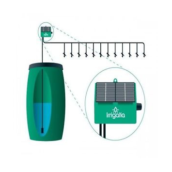 TROEVEN EN VOORDELEN Hoe meer zon, hoe meer water (geen druppel te veel of te weinig) - bewatert om de 3 uur Redt je planten van uitdroging en geeft water als je met vakantie bent Verbruikt 90% minder water als watergift via tuinslang of gieters Eco vriendelijk OVERZICHT Het slimme watergeef systeem van Irrigatia volgt de zon. Je irrigatiesysteem gebruikt een zonnepaneel op een heel interessante manier. Enerzijds om te detecteren of je planten water nodig hebben. Anderzijds om de pomp in het systeem aan te sturen. Je bevloeiingssysteem gaat mee met de dag maar ook met de seizoenen. In de lente en herfst geeft het systeem minder water dan in de zomer. Irrigatia heeft veel tijd besteed aan onderzoek om de beste en meest duurzame onderdelen te gebruiken. Dit is een heel degelijk systeem dat ontworpen is om levenslang water te geven in je tuin. Je krijgt een duidelijke en gedetailleerde handleiding in het Nederlands bij het product. Irrigatia biedt oplossingen voor voor kleine tot middelgrote moestuinen en vooral voor tuinkasten, serres of tunnels. In tegenstelling tot gebruikelijke timer systemen geeft Irrigatia zowel kleine als grotere hoeveelheden water, mee met de zon. Zo blijft je grond mooi verdeeld nat en loopt het water niet af en dat bespaart je water. Met 200 liter water kun je gemiddeld 3 weken water geven.