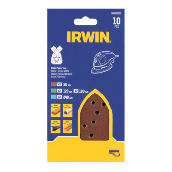 IRWIN schuurvelset IW8087303 is geschikt voor handpalmschuurmachines van Black+Decker type Mouse en Bosch type Primo. Dankzij de zelfhechtende laag en klittenbandbevestiging zijn de schuurvellen eenvoudig te bevestigen en is er nauwelijks speling tussen schuurvel en machine. Dat zorgt voor een hogere schuuropbrengst. Daarnaast hebben de schuurschijven een perforatie voor stofafzuiging, zodat stof minder snel in het schuurpapier blijft zitten. Afmeting schuurvel: 130x90mm. Inhoud: 10 stuks met verschillende korrel voor een variabel resultaat.