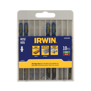 IRWIN decoupeerzaagset IW1014503 is een 10-delige set met een mix van hout-/ en metaalzagen. De cassette bevat 7 houtzagen en 3 metaalzagen met diverse vertandingen voor een fijne tot grove afwerking. De decoupeerzaagbladen hebben een T-aansluiting. De zaagbladen passen ook op de nieuwste generatie decoupeerzagen die een universele aansluiting hebben.