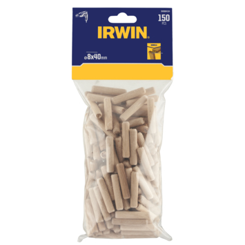 Houten deuvels IW9094104 van IRWIN hebben een diameter van 8mm en zijn 40mm lang. Inhoud: 150 stuks.