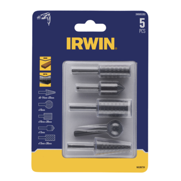 IRWIN raspset IW9091203 is een de 5-delige set voor het bewerken van hout en metaal. De set bestaat uit 4 raspen en een verzinkboor. De diameters van de raspen variëren van 6 tot 16mm. Passen op alle standaard boormachines.