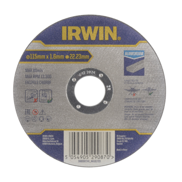 IRWIN Pro Performance aluminiumdoorslijpschijf IW8082141 is geschikt voor het doorslijpen van aluminium. De slijpschijf is plat, heeft een diameter van 115mm en is slechts 1,6mm dik. Omdat hij zo dun is kunt u er snel mee werken en verliest u minder materiaal. Past op alle gangbare 115mm haakse slijpers.
