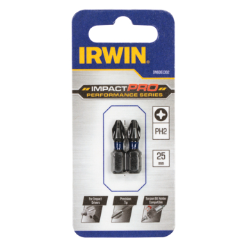 Irwin Impact PRO schroefbits zijn speciaal ontworpen om weerstand te bieden aan de enorme kracht van impact/slagschroevendraaiers. Ook zeer geschikt voor standaard accuschroefboormachines. Irwin IW6061302 is een Pozidriv schroefbit Ph2 met een lengte van 25mm. Inhoud: 2 stuks.