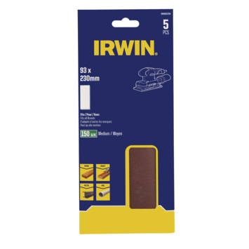 IRWIN 1/3vel schuurstroken IW8083704 zijn geschikt voor alle vlakschuurmachines met schuurzoolafmeting 189x91mm en klembevestiging. De schuurvellen zijn niet voorzien van perforatiegaten en hebben korrelgrootte 150. Dit zorgt voor een fijne afwerking, maar schuurt wel iets minder snel. Afmeting schuurstrook: 230x93mm. Inhoud: 5 stuks.
