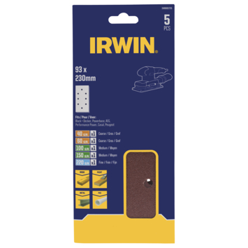 Irwin schuurvel 230 x 93 mm K40/K60/K100/K150/K220 voor klembevestiging, met perforatie voor B+D, 5 stuks.