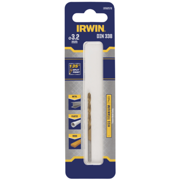 IRWIN HSS Titanium boor 10502578 is een metaalboor met de volgende afmetingen: Ø 3.2mm / werklengte 36mm / totale lengte 65mm. Inhoud: 1 stuk. HSS TITANIUM metaalboren van IRWIN zijn geschikt voor het boren in hard staal en hard gelegeerd staal. De speciaal ontworpen 135° boorpunt zorgt voor een perfecte centreerkwaliteit en vereist minder inspanning/invoerdruk. Het boorlichaam van hoogwaardig HSS staal met Titaniumnitridecoating (TiN) maakt de boor beter hitte- en wrijvingsbestendig, waardoor deze een levensduur heeft die 4x langer is dan van vergelijkbare standaardboren. Ook zeer geschikt voor het boren van allerlei non-ferromaterialen, kunststof, pvc en hout. Voldoen aan kwaliteitsnorm DIN 338. Geschikt voor alle gangbare gesnoerde boormachines en accuboormachines.