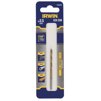 IRWIN HSS Titanium boor 10502580 is een metaalboor met de volgende afmetingen: Ø 3.5mm / werklengte 39mm / totale lengte 70mm. Inhoud: 1 stuk. HSS TITANIUM metaalboren van IRWIN zijn geschikt voor het boren in hard staal en hard gelegeerd staal. De speciaal ontworpen 135° boorpunt zorgt voor een perfecte centreerkwaliteit en vereist minder inspanning/invoerdruk. Het boorlichaam van hoogwaardig HSS staal met Titaniumnitridecoating (TiN) maakt de boor beter hitte- en wrijvingsbestendig, waardoor deze een levensduur heeft die 4x langer is dan van vergelijkbare standaardboren. Ook zeer geschikt voor het boren van allerlei non-ferromaterialen, kunststof, pvc en hout. Voldoen aan kwaliteitsnorm DIN 338. Geschikt voor alle gangbare gesnoerde boormachines en accuboormachines.