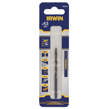 IRWIN HSS Turbomax boor 10502215 is een metaalboor met de volgende afmetingen: Ø 45mm / werklengte 47mm / totale lengte 80mm Inhoud: 1 stuk HSS TURBOMAX metaalboren van IRWIN hebben een unieke 100° punt die er voor zorgt dat zelfs op gebogen oppervlakken de boor niet wegloopt en de boor zich 10x sneller vastbijt in het metaal De boorkop zelf is geslepen in 140° wat zorgt voor minimale braamvorming en een gladde afwerking Het boorlichaam is vervaardigd van W9 snelstaal voor scherpere snijranden en optimale hittebestendigheid en is extra gehard tot 63-66 HRC Ook geschikt voor roesvrij staal en allerlei non-ferromaterialen kunststof pvc hout en hardhout Vergeet echter nooit koelmiddel te gebruiken bij boren in roestvrij staal De schacht heeft onderaan 3 vlakke zijden voor een optimale klemming in de boorkop om slippen tegen te gaan Geschikt voor alle gangbare gesnoerde boormachines en accuboormachines