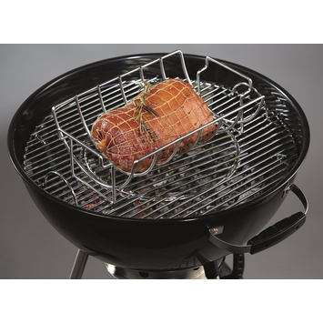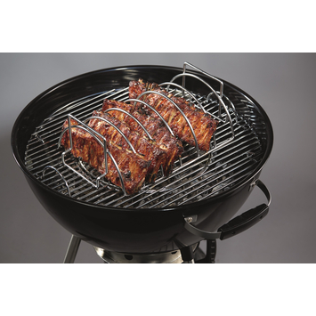 Gebruik dit ribrek om snel en netjes meerdere spareribs te grillen op je barbecue. Je zet de ribs rechtop in het rek, waardoor ze gelijkmatig garen en je ruimte overhoudt op je rooster. Dit is vooral handig bij uitgebreide BBQ-sessies of als je veel tegelijk wilt bereiden. Het rek is van roestvrij staal en goed bestand tegen hitte. De afmetingen zijn 39 x 25,5 x 13 cm. Door de open structuur kun je het vlees makkelijk draaien of marineren tijdens het grillen. Na gebruik maak je het rek eenvoudig schoon. Zo is het snel klaar voor een volgende ronde spareribs.